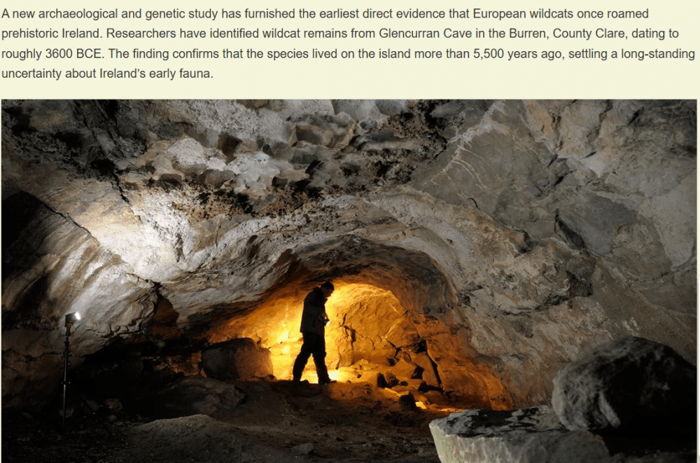 W Glencurran Cave w regionie Burren w hrabstwie Clare archeolodzy odkryli najstarsze znane szczątki dzikiego kota (Felis silvestris) w Irlandii. Zbliżona data, z której pochodzi znalezisko to 3600 rok p.n.e.