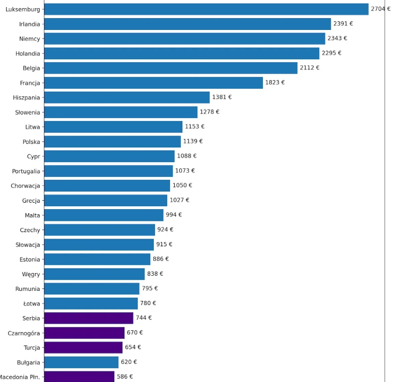 W ujęciu nominalnym, czyli w prostym porównaniu miesięcznych kwot brutto, liderem pozostaje Luksemburg, gdzie płaca minimalna sięga 2 704 euro. Tuż za nim plasują się Irlandia, Niemcy, Holandia i Belgia - to jedyne kraje w Unii Europejskiej, w których minimalne wynagrodzenie przekracza 2 000 euro miesięcznie. Na drugim biegunie znajdują się państwa Europy Wschodniej i Południowo-Wschodniej. Bułgaria zamyka unijną stawkę z kwotą 620 euro, a w krajach kandydujących do UE różnice są jeszcze większe - w Ukrainie płaca minimalna wynosi zaledwie 173 euro.